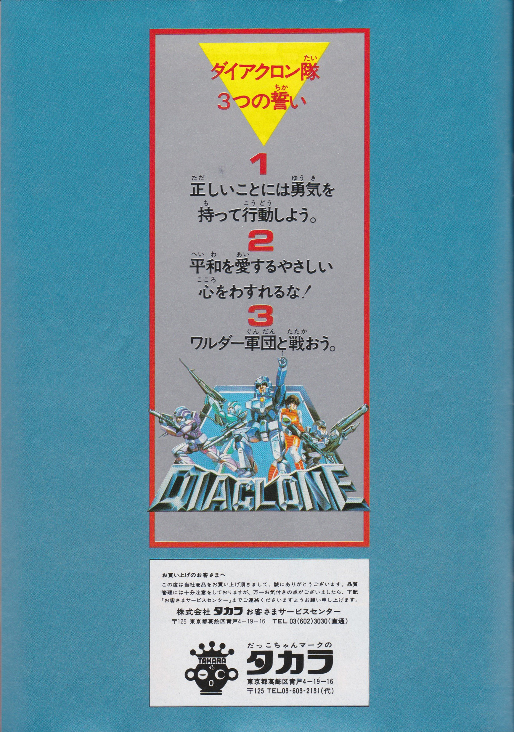 Six years on, we end where we began – the three vows. This masterpiece of a catalog does not disappoint, as there is all-new art of Diaclone Personnel posing in their Type 3 suits. Over 30 years later, the three vows would return, appearing on materials for Takara’s adult-oriented Diaclone reboot line.