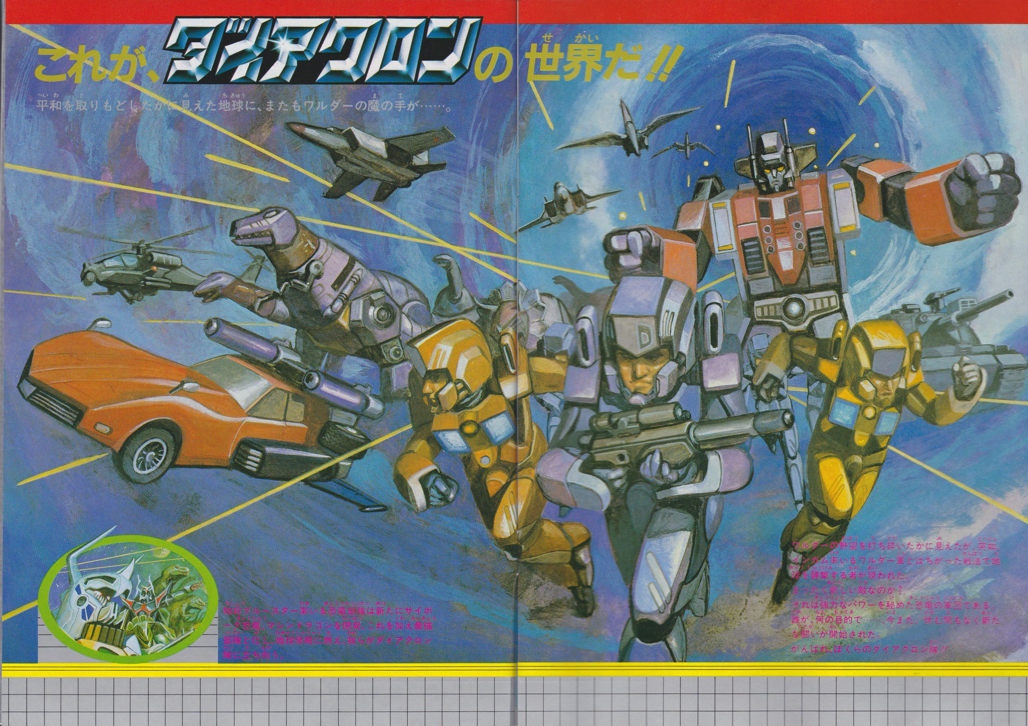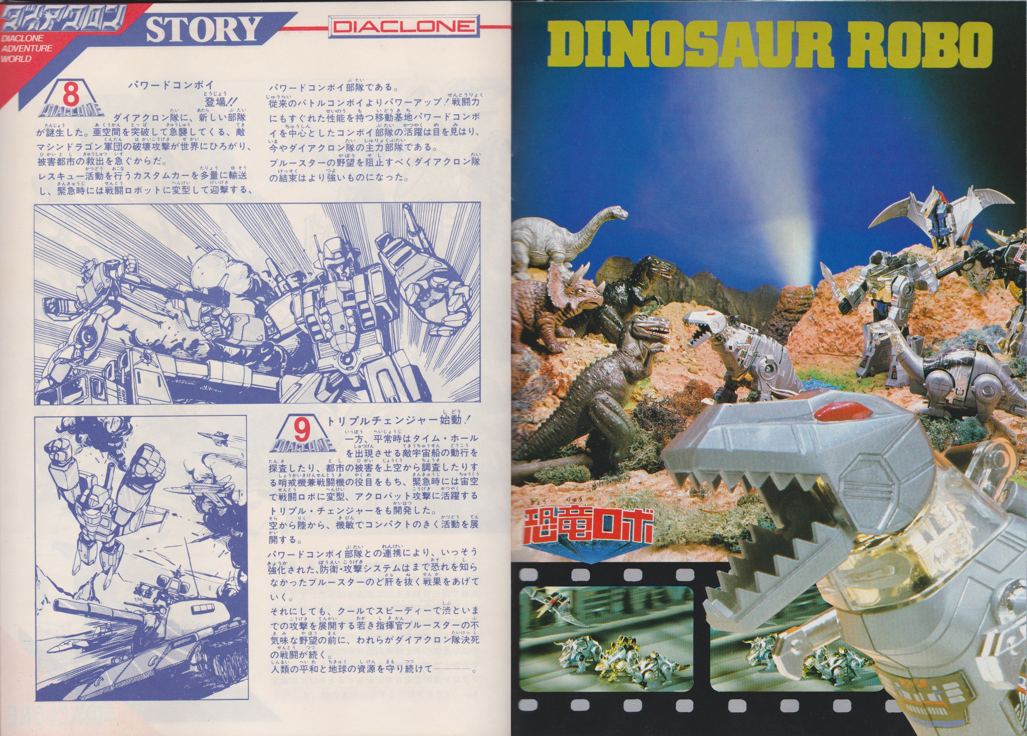 The first spread is a traditional two-page art spread featuring all of the newest figures. We see again the pre-production design Powered Convoy, the Dinosaur Robo, the new Triple Changers, and the final Car Robots design: Corvette Stingray. Leading the way are three humans in Type 3 Diaclone personnel suits (now known as Dia-Nauts). Inset in the bottom left corner is art of Blue Star with his dinosaur army, recycled from the previous 1984 catalog.